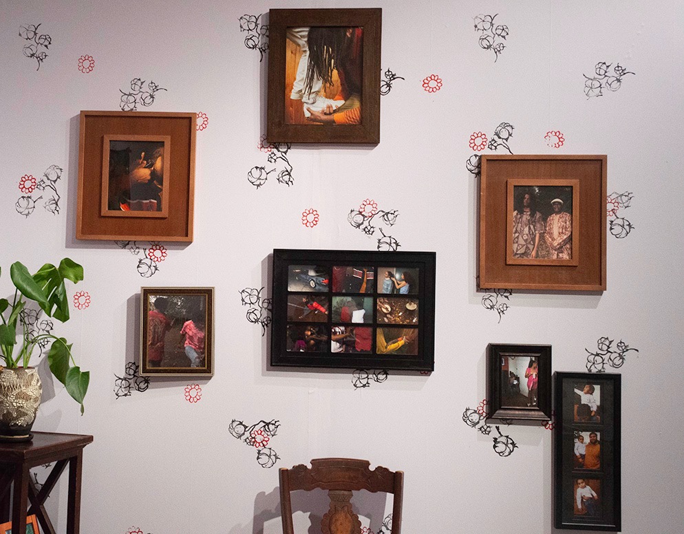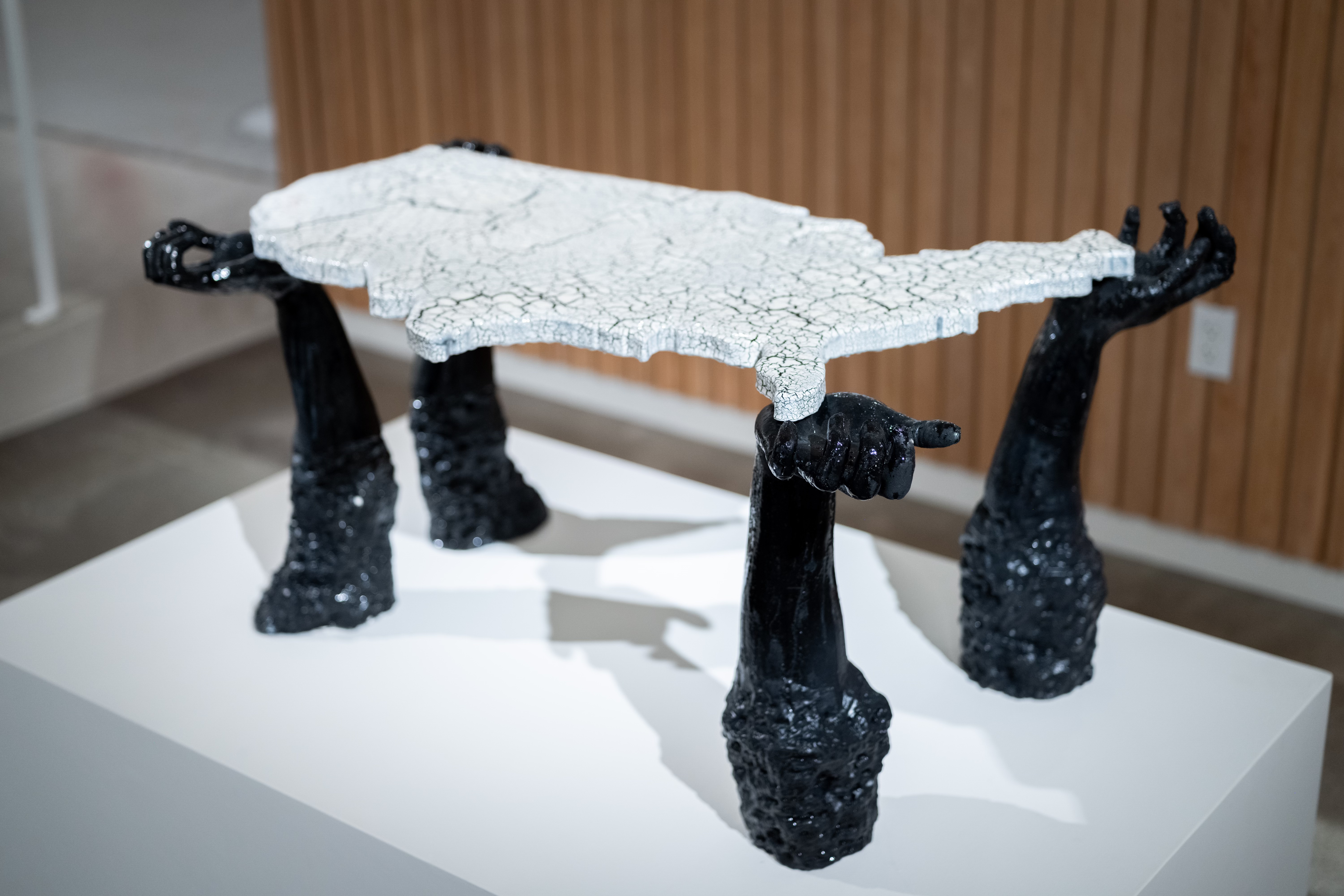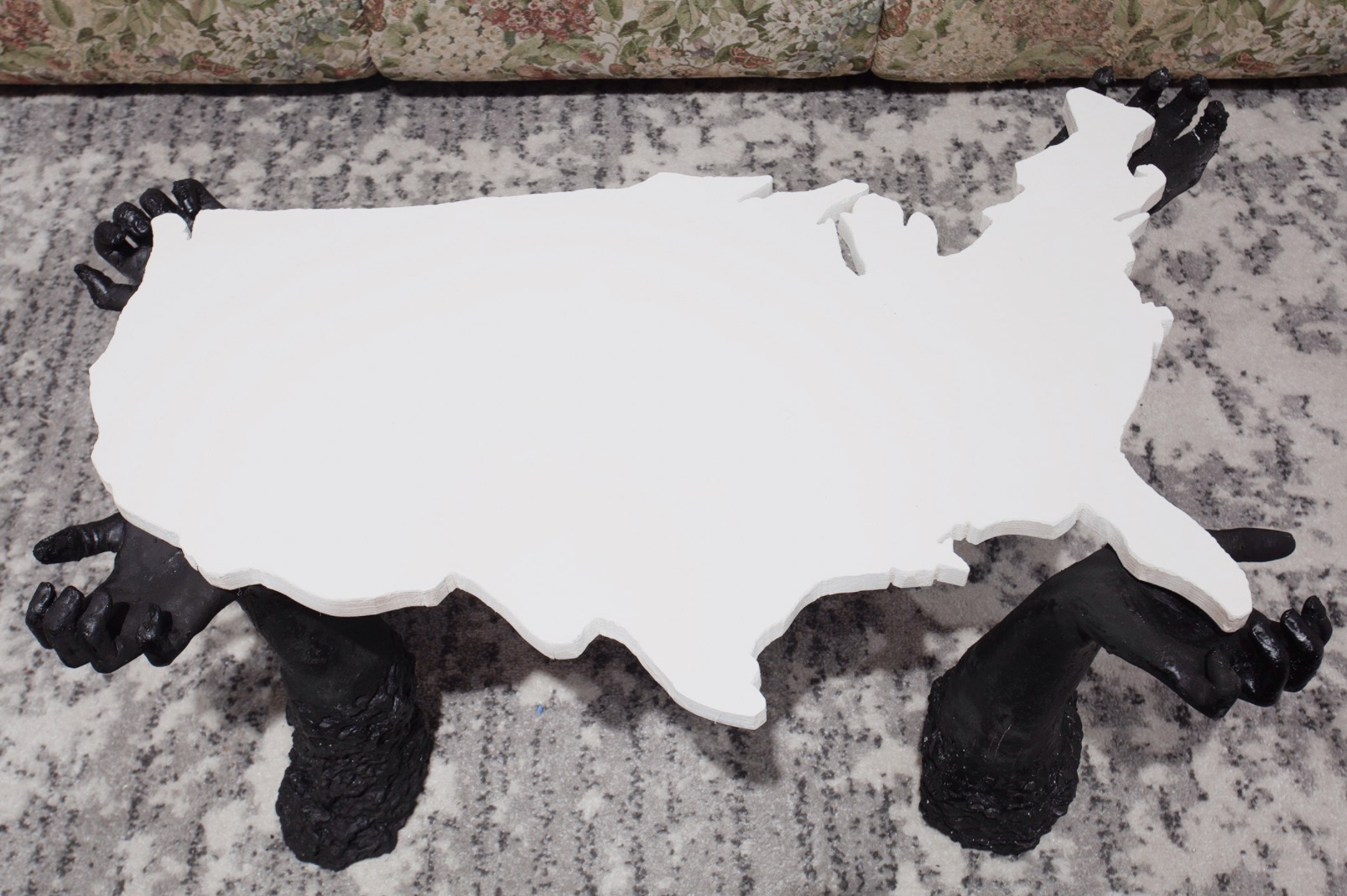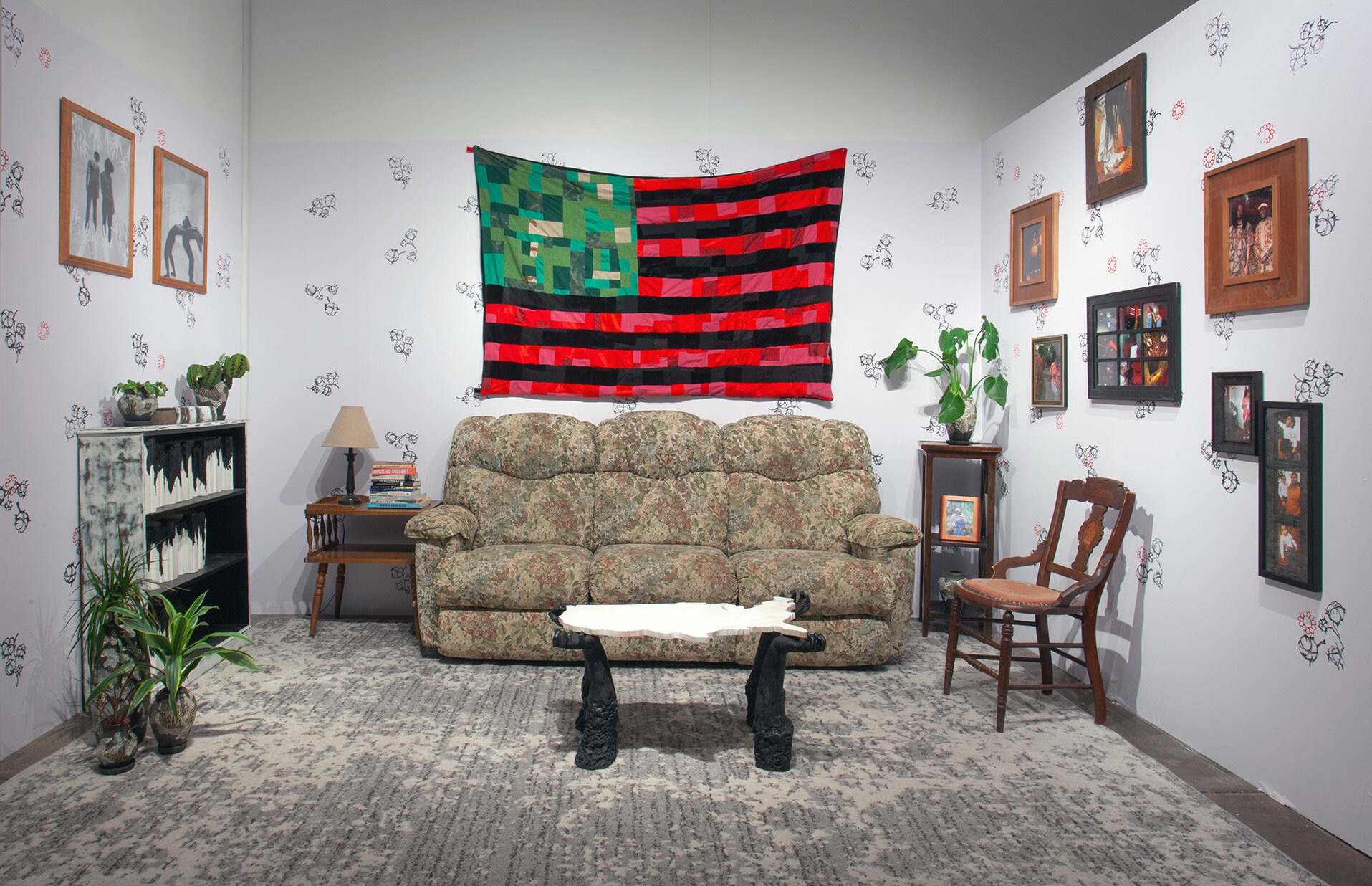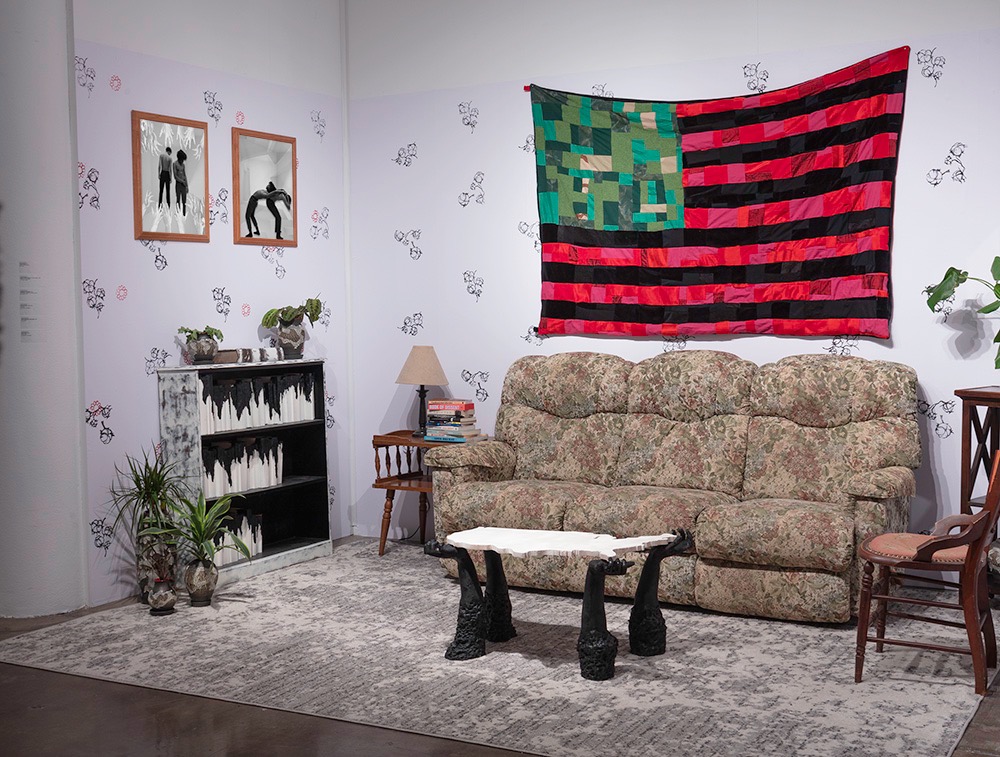 In the installation Uncovering Identity, I aim to encapsulate a living room, reminiscent of one in my grandmother’s home, as a means to elaborate and comment on what is often one of the most central spaces in constructing one’s identity. A bookshelf filled with white books covered in tar highlight the exclusion of black bodies within white-washed, Eurocentric valued literature. Black and white photos draw attention to the consumption of blackness. A quilted black liberation flag drapes over a couch, reclaiming a history of quilting that is also asserting themes of community and care. A United States-shaped coffee table held up by black hands shed light on the unseen contributions from people of color that serve as foundations for this country, and planter vases throughout the room are symbolic of the black bodies stretched to their limits while still being vessels capable of growth. The installation intends to disrupt and dismantle a complicated and often racist history in the U.S. that has failed to offer an accurate representation of me as well as other people of color.