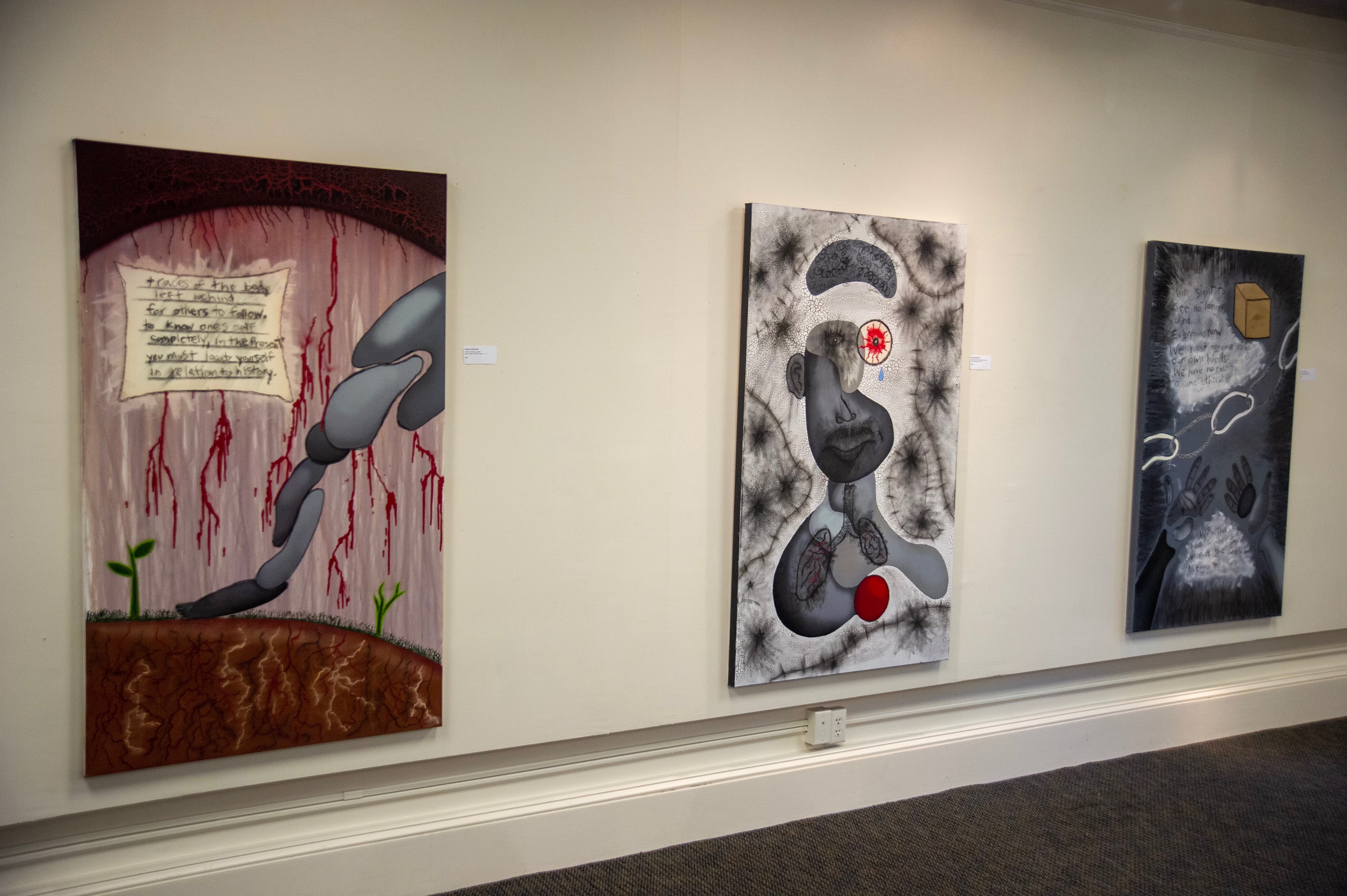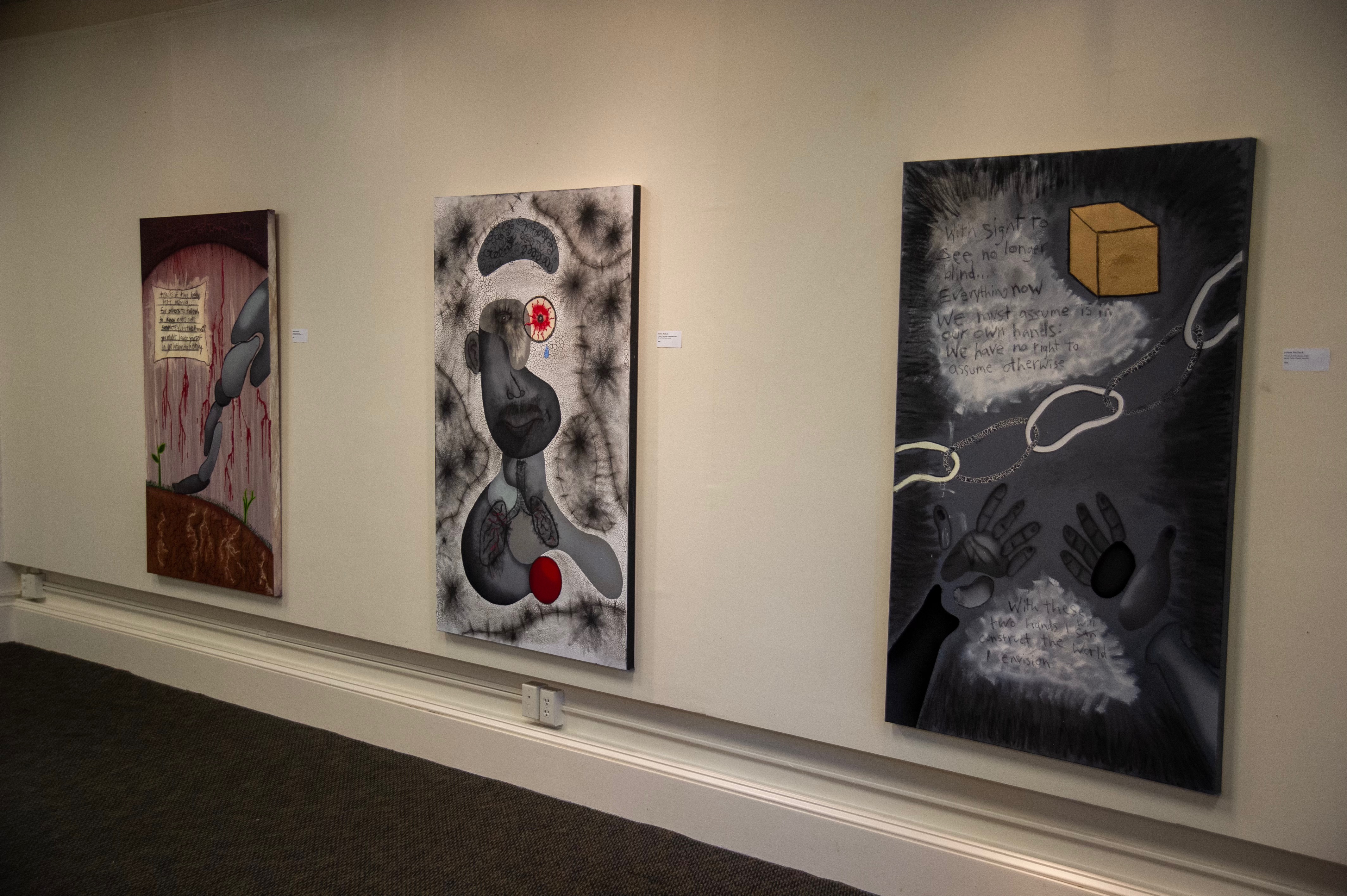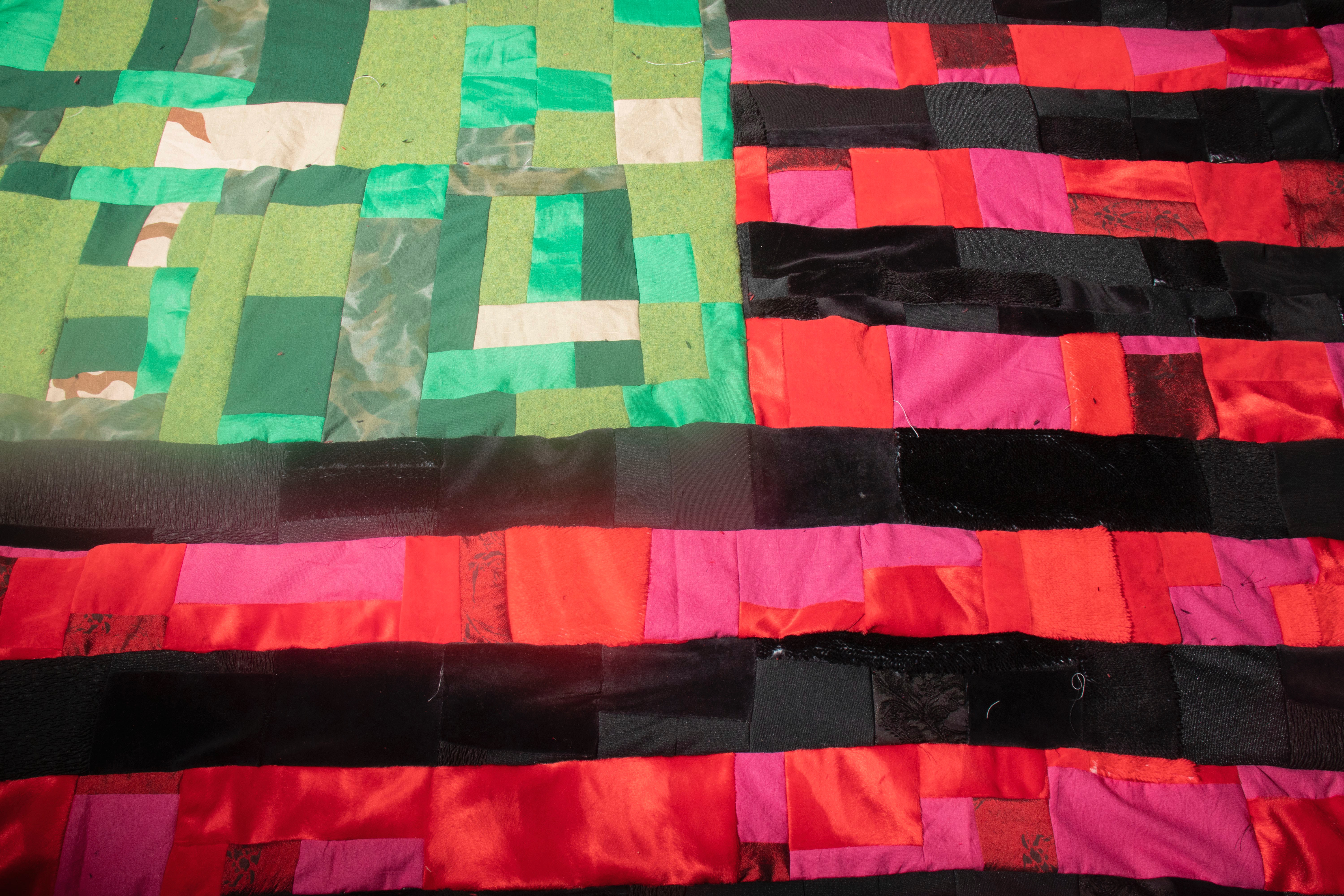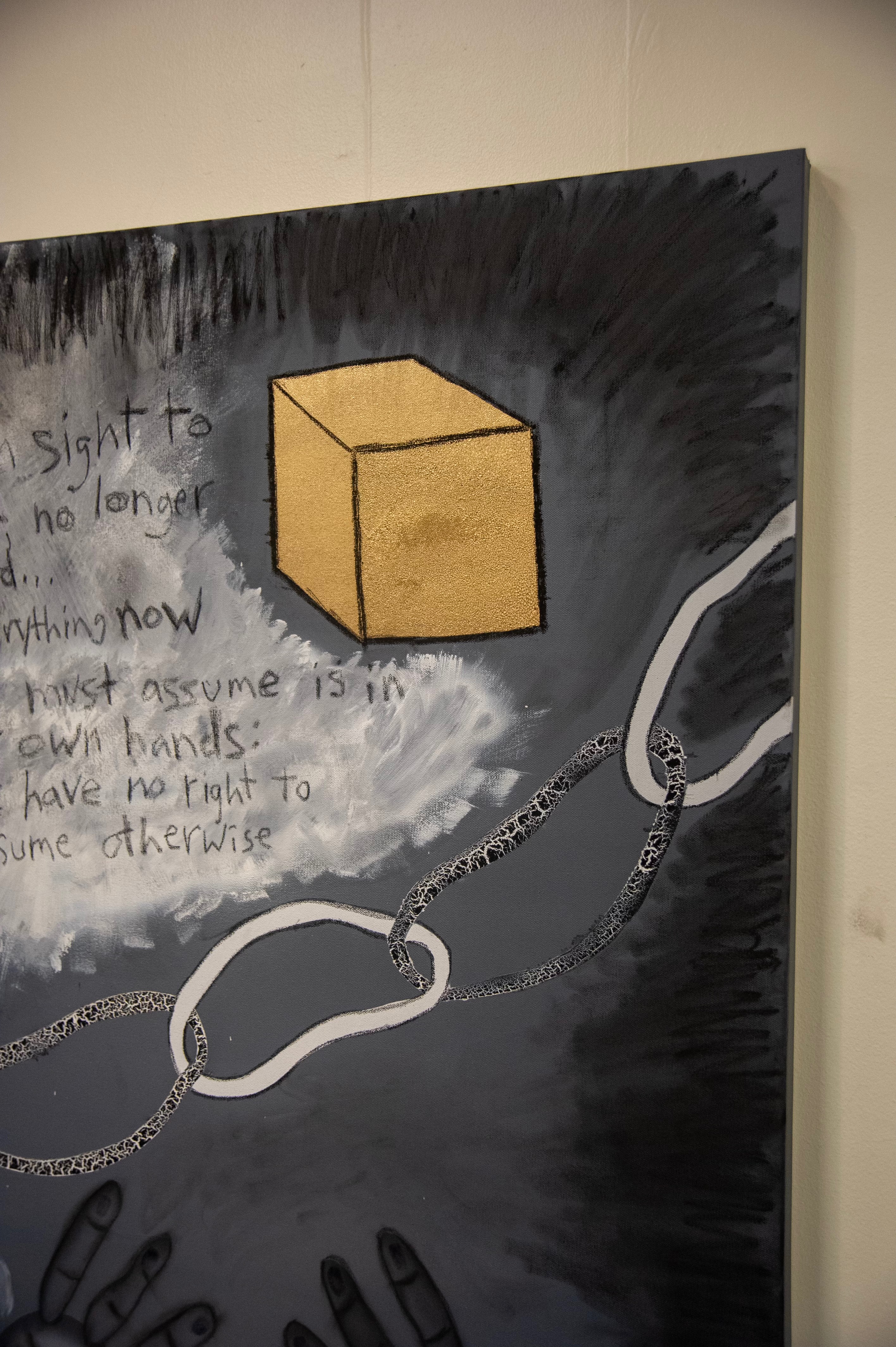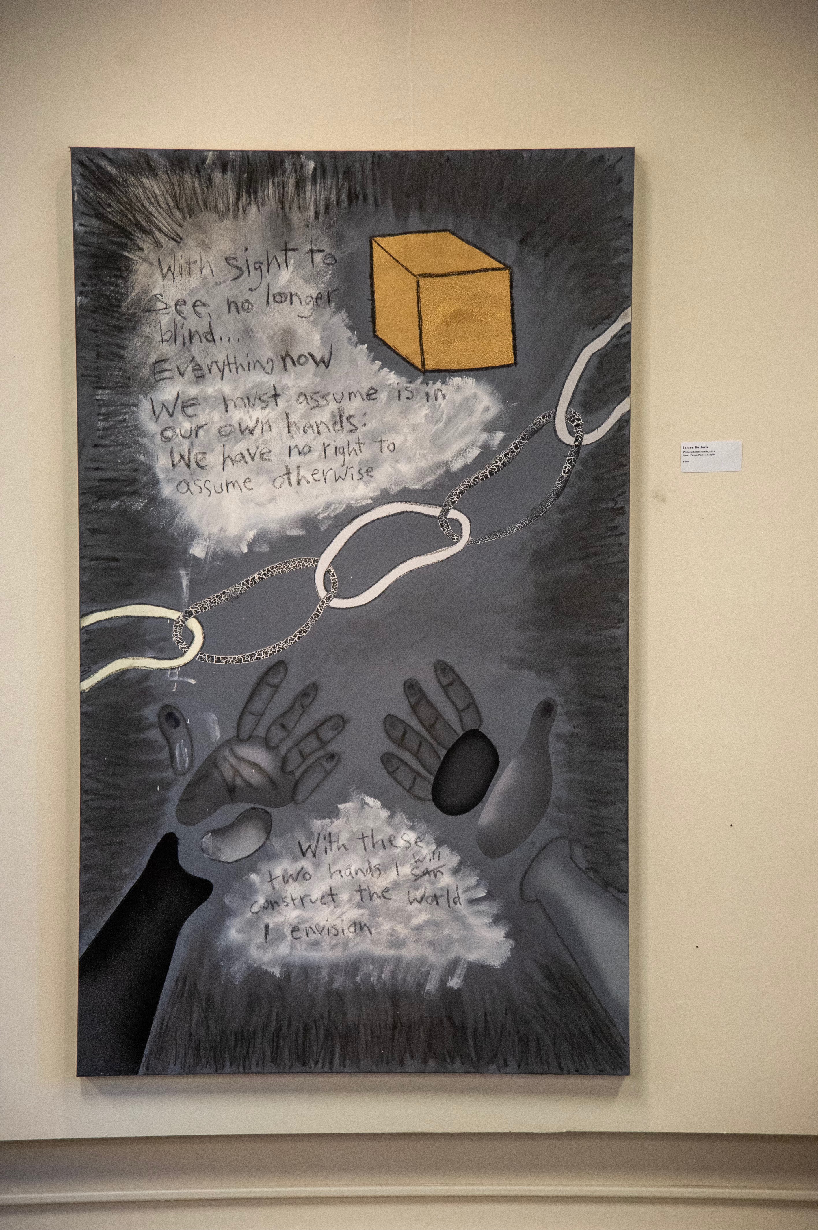 In the installation Uncovering Identity, I aim to encapsulate a living room, reminiscent of one in my grandmother’s home, as a means to elaborate and comment on what is often one of the most central spaces in constructing one’s identity. A bookshelf filled with white books covered in tar highlight the exclusion of black bodies within white-washed, Eurocentric valued literature. Black and white photos draw attention to the consumption of blackness. A quilted black liberation flag drapes over a couch, reclaiming a history of quilting that is also asserting themes of community and care. A United States-shaped coffee table held up by black hands shed light on the unseen contributions from people of color that serve as foundations for this country, and planter vases throughout the room are symbolic of the black bodies stretched to their limits while still being vessels capable of growth. The installation intends to disrupt and dismantle a complicated and often racist history in the U.S. that has failed to offer an accurate representation of me as well as other people of color.