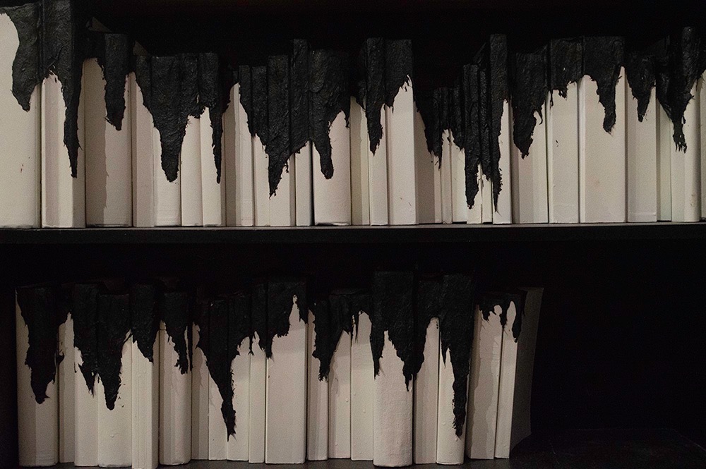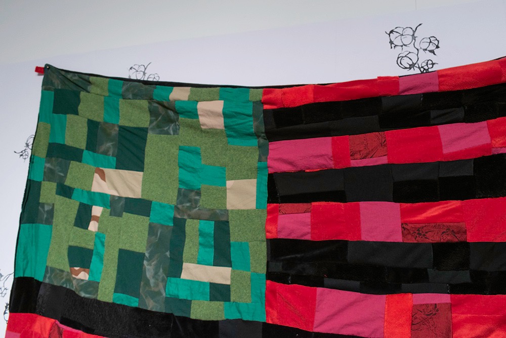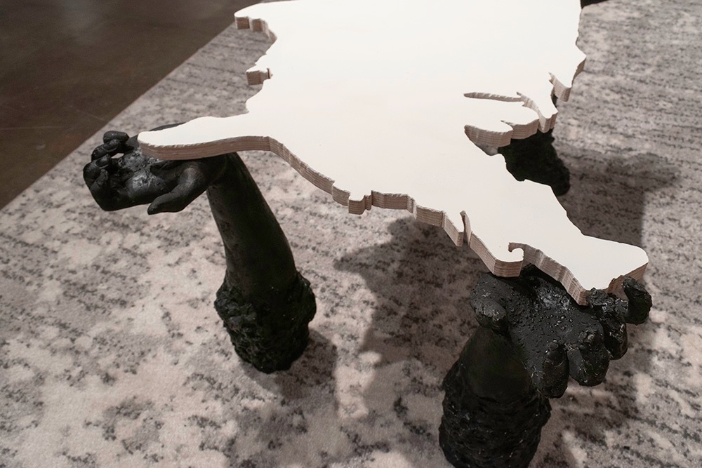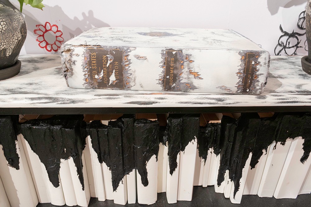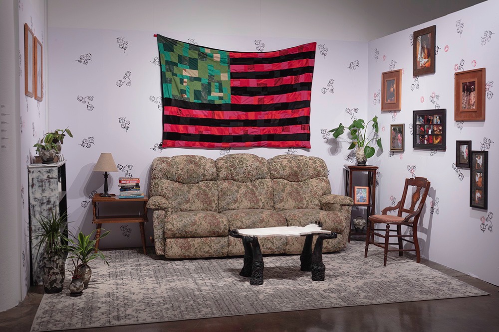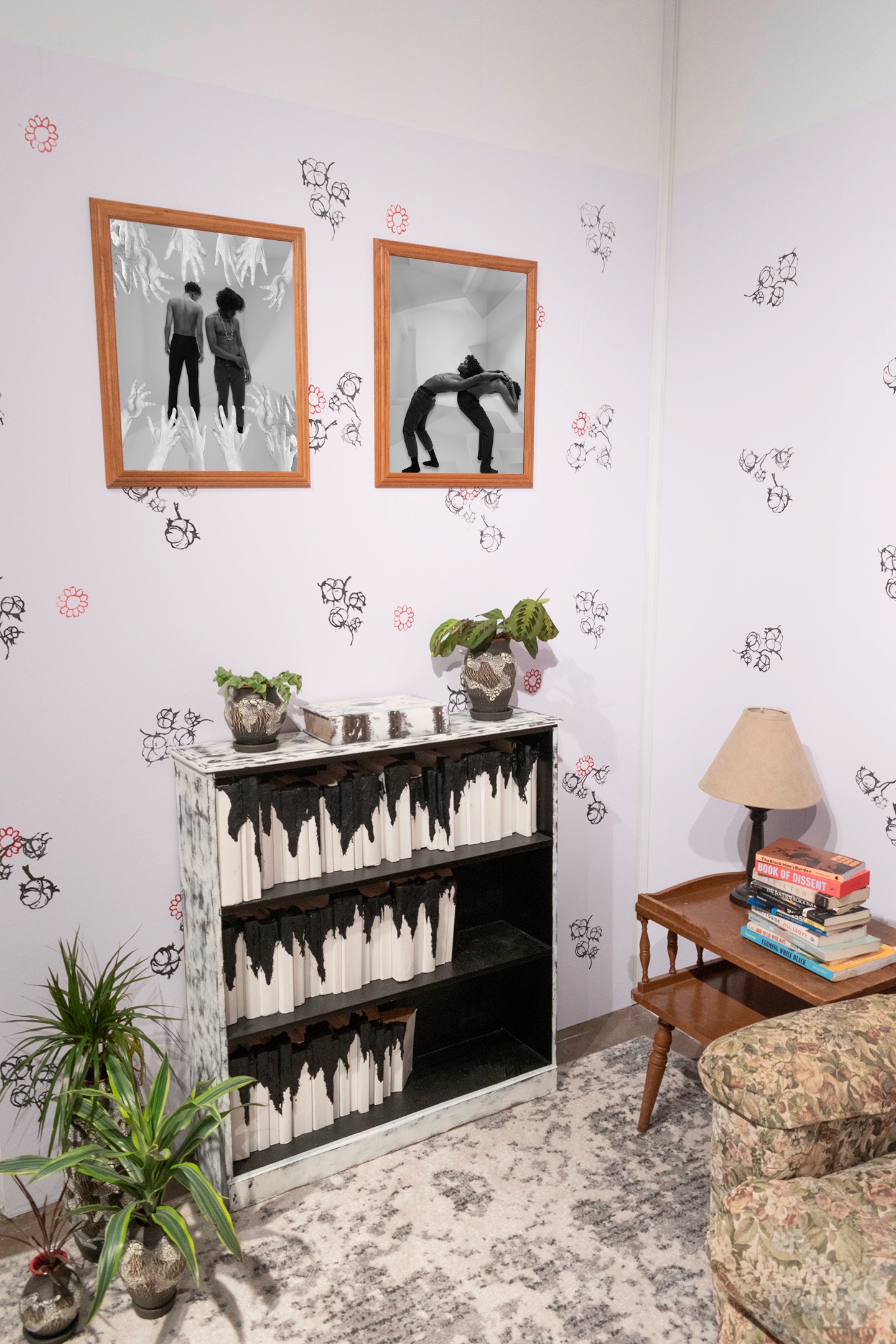 Incidents of identity, 2021, books, wood, spray paint & tar | Consuming, 2021, digital media | Black Liberation Flag, 2020, soft textile | Built by Black History (coffee table), 2021, plaster, wood, paint & ink | Growing Pains, 2020, ceramics